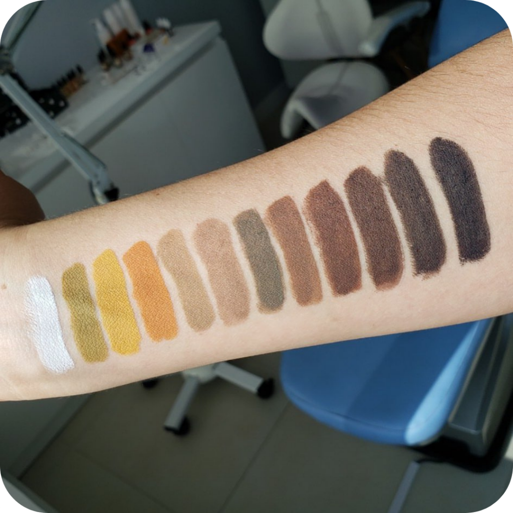 Os pigmentos inorgânicos são mais suaves, com cores que tendem a cicatrizar para o camurça. Dessa maneira, são ideais para shadow, técnicas mais sólidas, profissionais com mão mais pesada ou clientes com pele fina ou desvitalizada. Inclusive, atendem do fototipo 1 ao 6 e podem ser usados tanto puros quanto em misturas.