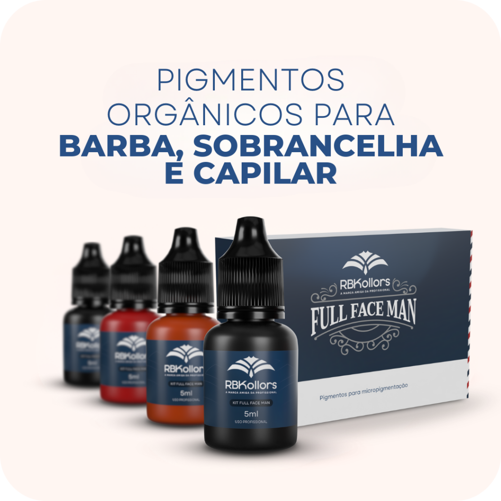Criados pela RBKollors para atender técnicas de sobrancelhas, barba e capilar em todos os fototipos, esses pigmentos fazem parte do Kit Full Face Man. Ao reunir 4 pigmentos de 5ml com diferentes intensidades de preto e um vermelho inorgânico puro, o kit garante resultados naturais, estáveis e duradouros.